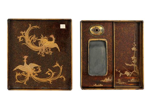 ‡  Property from the Collection of Jean SaportaA suzuribako [writing box]Edo period, 17th century the rectangular box with overhanging cover, canted edges and corners, decorated in gold and black hiramaki-e, takamaki-e, kimpun, keuchi and inlays of gold foil, with pavilions and trees among rockwork, two geese on a small promontory beside fishing nets, the interior with two archaic ho-o birds on a sparse nashiji ground, fitted with an ink slate, copper-gilt water dropper, and a brush tray in gold hiramaki-e with a plum tree and grasses, sparse nashiji interiors, fundame rims 23 x 21 x 4.5 cm  Provenance: Henri Cartier-Bresson (1908-2004) Condition Report: This fine early suzuriabko with wear to the cover and a few small scratches, and minor frits to the edges, the lower and top edge has a crack which has been restored, the fundame rims worn, the slate with minor chips to the rim, the base with scratches, small dents and pitting consistent with the age and use of the object.Condition Report Disclaimer