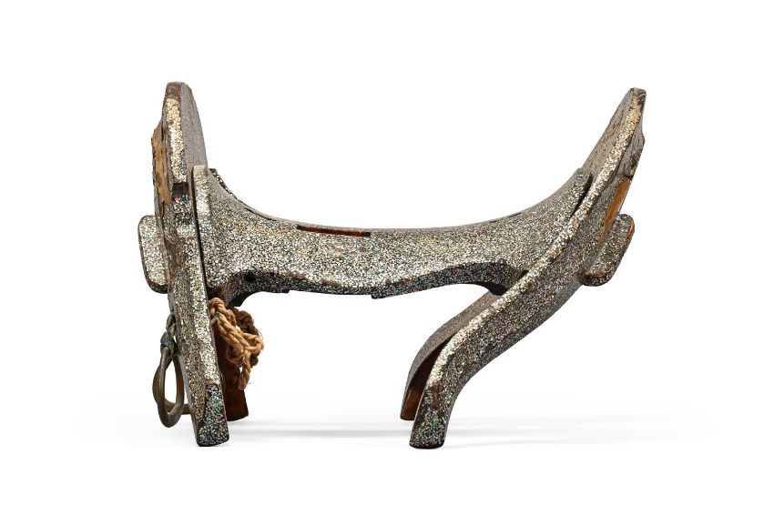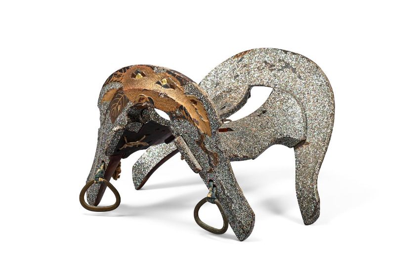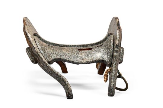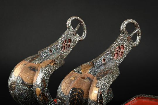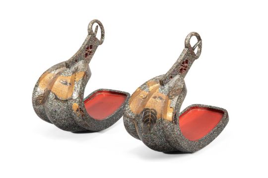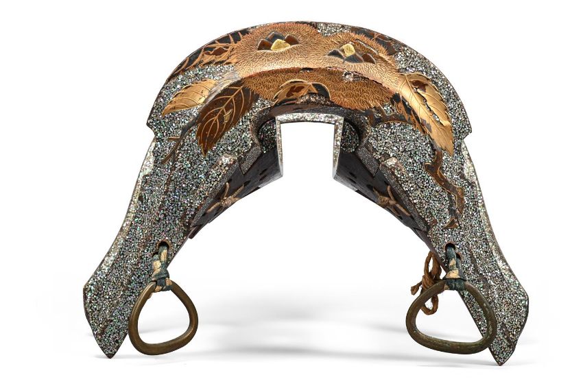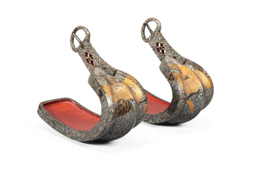 Y‡  Property from the Collection of Jean SaportaA lacquer kura [suddle] and abumi [stirrups] ensuiteMomoyama-Edo period, late 16th - early 17th century  the riding saddle fitted with two lacquered igi [wood side boards], maewa [pommel] and shizuwa [cantle] of yamagata [highly-seated; 'mountain-shaped'] form, the pommel with the two umi ['sea'] and iso ['shore'] registers almost evenly constructed, low-shouldered tegata [hand-shaped] indentations carved to each side, the seat densely applied in inlays of mother-of-pearl, the pommel decorated in gold and black hiramaki-e, takamaki-e and keuchi with acorns among foliage, the abumi of typical form, similarly decorated, red lacquer interiors. approx. 37 cm. long (the saddle)rach approx 27cm long (the stirrups) Condition Report: Overall, the saddle is in good condition for its use, there are some slight losses to the lacquer and mother-of-pearl, in particular to the back of the seat as can be seen see in the illustration, the pommel has a number of small cracks and the lacquer is lifting, some wear overall, the reverse of the cantle is missing some lacquer on the upper part consistent with age and use; the stirrups overall in good condition considering their use, with some small areas of mother-of-pearl missing, one stirrup with a crack running across the red lacquer interior, the other has slight damage to the front and wear to the red lacquer interior, a slight crack to the chestnut.  Condition Report Disclaimer