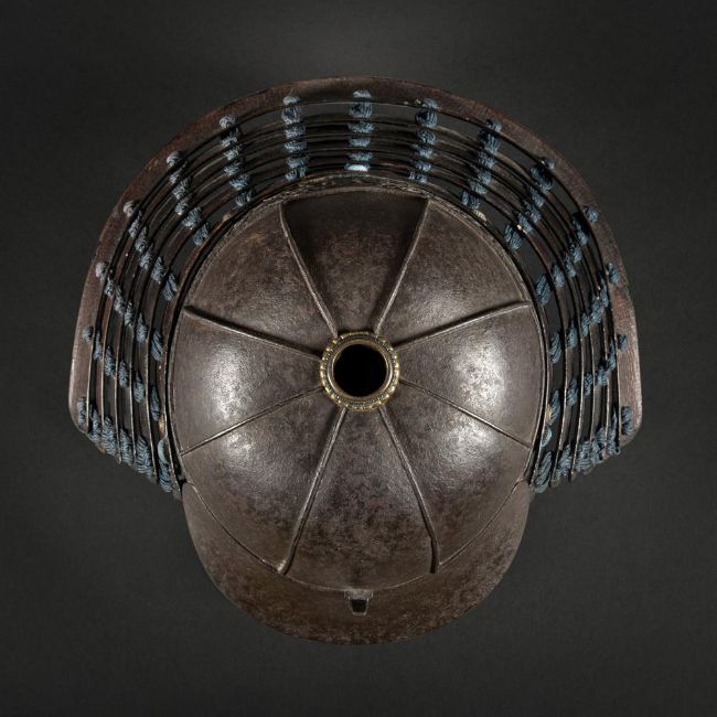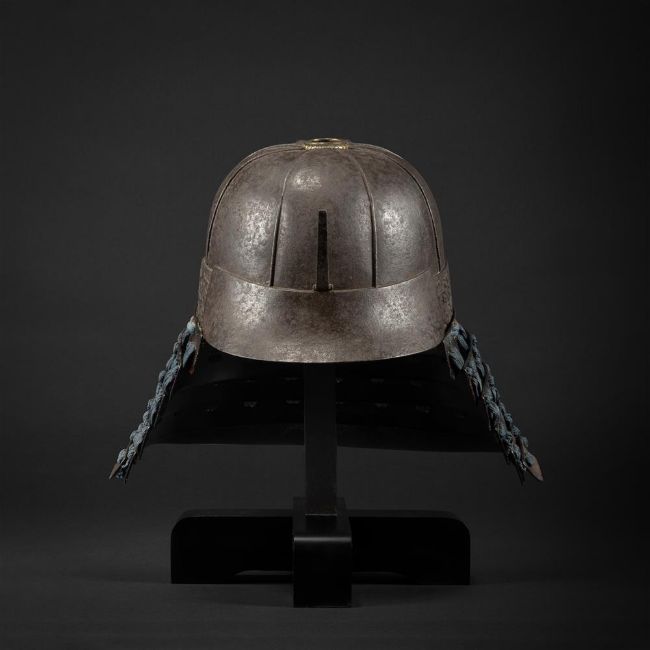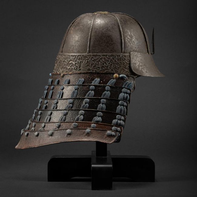 ‡  Property from the Collection of Jean SaportaAn eight-plate iron kabuto [helmet] and mempo [face mask]Momoyama period, late 16th century  the eight-plate russet iron bowl with raised ridged, the rim carved and chased with scrolling foliage of archaic form, russet iron peak with red lacquer underside, the leather three-tiered neck guard with spaced lacing in blue braid, interior linen lining, the russet iron ressei mempo with flared nostrils and open mouth, deeply embossed wrinkles, detachable nose-plate, silver teeth, red lacquer interior, black lacquer four-tiered throat protector with close-spaced lacing in green braid 35 cm. wide Condition Report: the helmet bowl with some pitting and minor rust consistent with age and use, a few small dents and nicks to the neck guard, the black lacquer underside redecorated, the red lacquer to the reverse of the peak well worn, the linen lining worn, the mempo with slight chips to the lacquer on the interior and a few minor cracks, the yodaregake slightly worn with some detached lacing, the mask with surface rust consistent with age and use.  Please note that the lot is sold without the display stand. A stand can be ordered through the department.  Condition Report Disclaimer