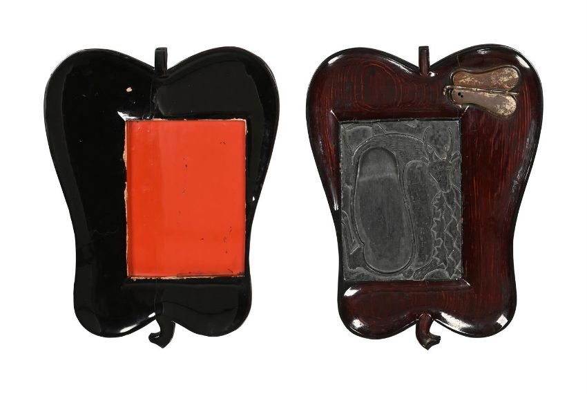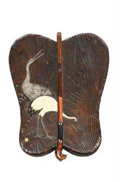 ‡  Property from the Collection of Jean SaportaA suzuribako [writing box] Sealed Kan, after Ritsuo Edo period, early 19th century  in the form of a gunbai [war fan] with flush-fitting cover, decorated in Ritsuo style with inlays of crackled-cream glazed ceramic and silvered-copper on paulownia wood, with two red-capped cranes, the interior of the cover in black and red lacquer, fitted with an ink slate chased and engraved with a stag beside a stylised tree, copper-gilt water dropper also in the form of a gunbai  35.9 x 28 x 4 cm. Provenance: Christie's, New York, Crafted Landscapes: The Ankarcrona Collection of Japanese Lacquer and Asian Works of Art, 1st October 2020, Lot 19.  Literature: Gaston Migeon, Les chefs d'œuvre de l'Art japonais, (Paris, 1970), no. 127.  This unusual writing box is in the shape of a gunbai, or war fan used by military commanders to signal their troops. The cover of the box is bisected by a bamboo stem in high relief for the fan's central rib, rendered with careful attention to the variations in the form of the nodes. In the style of Ogawa Haritsu (1663-1747) [see Lot 29], the pair of red-capped cranes are inlaid on the wood surface in crackled-cream glazed ceramic and lead. Formerly in the Ankarcrona collection. Sten Ankarcrona (1861-1936) began collecting Japanese art in the late 1880s while serving as an officer in the Swedish navy. He developed a lifelong interest in Japanese lacquerware. During a later visit to Japan in 1923, undertaken at the request of the King of Sweden, he acquired numerous additional works. The collection was subsequently expanded by his descendants throughout the 20th and early 21st centuries.   Condition Report: The wood cover with various dents and scratches as can be seen in the illustration, consistent with the use of the object, there is some lacquer loss to the ridge surrounding the ink stone, the ink stone with a few minor chips as can be seen in the illustration, the interior and base with some wear. Condition Report Disclaimer