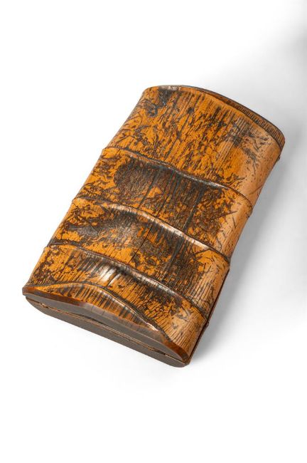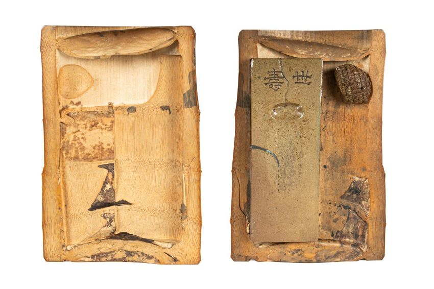 ‡  Property from the Collection of Jean SaportaA suzuribako [writing box]Edo period, 17th century the irregularly shaped rectangular bamboo box with overhanging cover, the pronounced ridges of the bamboo delineated 30.2 x 21 x 7.5 cm.  Provenance: Edmund Lewis Literature: Stephen Little and Edmund J. Lewis, View of the Pinnacle Japanese Lacquer Writing Boxes: The Lewis Collection of Suzuribako, (Honolulu, 2011), p. 104-107, no. 44. Formed from a large section of moulded bamboo, this unusual writing box contains an unglazed stoneware water dropper in the form of a pinecone, bamboo brushes, a knife, and a glazed stoneware ink slab. The exterior retains a rustic design and finish, shaped to appear as if hewn directly from nature. Jozan (1583-1672) was a scholar, calligrapher, warrior, and Buddhist monk of the early Edo period (1615-1868). He is renowned for his calligraphy in the ancient clerical script and for his retreat in Kyoto, the Shinsendo (Hall of the Poetry Immortals). The bamboo box is crafted from a flattened section of bamboo to serve as a container for an inkstone. The water dropper and ink slab are both made of Asahi ware (Asahi-yaki) from Uji, south of Kyoto, and each bear the same Asahi seal. Asahi ware originated in the 1600s, with its founding attributed to the potter Okamura Jiroemon. The ink slab is inscribed in seal script on the upper surface with its name, Seju [Generations of Longevity], above a small ovoid depression for holding ground ink. The underside bears a carved inscription in standard script: In the small pond, no more than an inch long, the wind whips the waves.One brush, soaked with ink - characters are born.Inscribed and written by Ishikawa Jozan of Sanyo The writing box is accompanied by an authentication paper by Kohitsu Ryochu (1819-1891)  Condition Report: The cover with shrinkage to the bamboo resulting in slight cracks, some chips to the interior of the cover and base.Condition Report Disclaimer