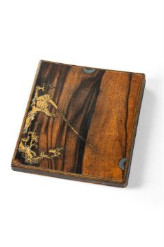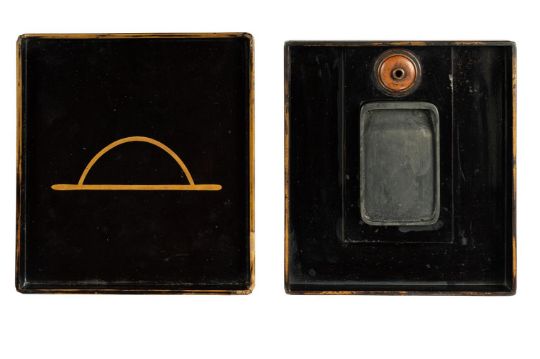 ‡  Property from the Collection of Jean SaportaA suzuribako [writing box] Momoyama - Edo period, late 16th - early 17th century  the rectangular box and cover with canted corners and edges, decorated in gold and black hiramaki-e and takamaki-e on a polished wood ground, with a long-armed monkey seated in the branches of a gnarled plum tree, attempting to grasp the reflection of the moon in a pool of water, the interior of the cover in gold hiramaki-e on a black ground, fundame rims, fitted with an ink slate and copper water dropper 20 x 18 x 2.5 cm. Condition Report: There is wear to the gold lacquer and a small piece of gold inlay missing from the plum branch, each corner of the cover with a slight crack, the cover with some slight warping with age, slight wormage, the interior of the cover with some old wear as can be seen in the illustration, slight wear and dents to the base.Condition Report Disclaimer