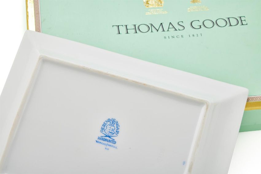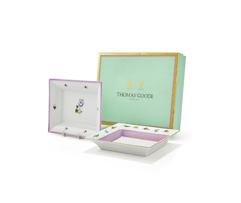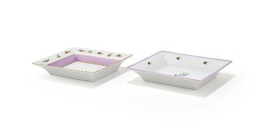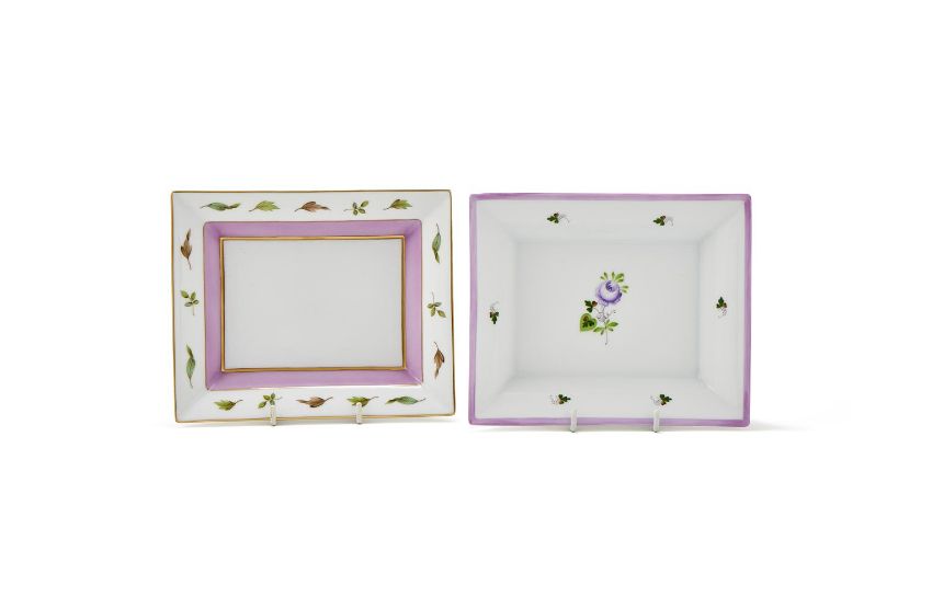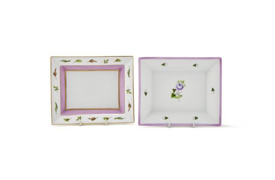 HEREND, TWO RECTANGULAR CERAMIC POCHES VIDES The first Herend Homage A Saxe with a decorative leaf border and lilac glazed section, with gilt detail, marked Herend Hungry Handpainted 7631.0.00/QHVT 2.2 RF The second Herend Vienna Rose with lilac flower and leaf glazed decoration, with lilac border, marked Herend Hungry Handpainted 7631.0.00/VRHL RA 19 x 15.5 x 3.5cm Both in Thomas Goode card boxes