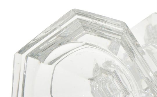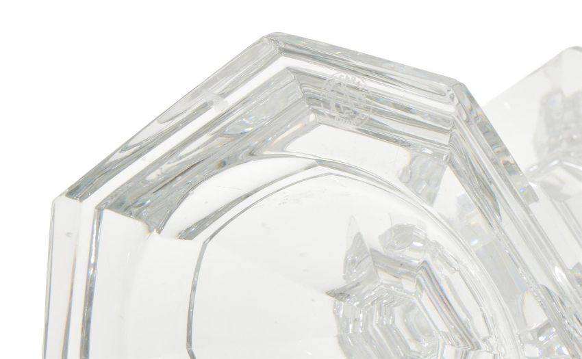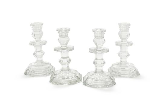 BACCARAT, TWO PAIRS OF GLASS CANDLESTICKS Of varying facetted octagonal knopped designs, signed Baccarat France One pair 18.8cm high, the other 18.5cm high