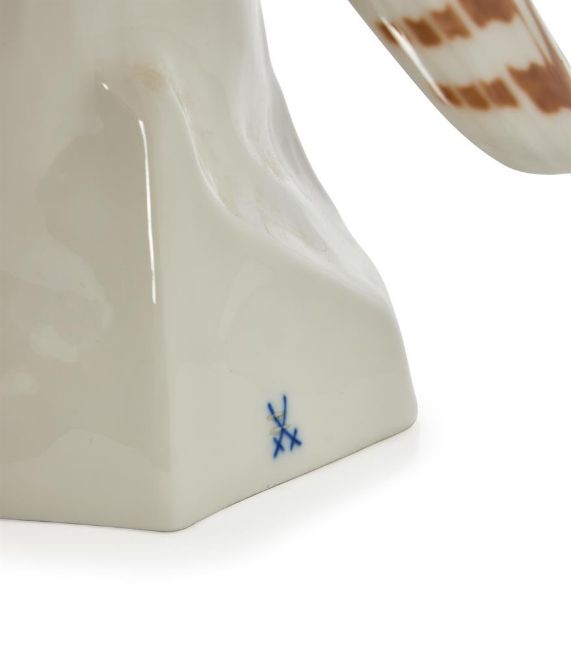 A MEISSEN ART NOUVEAU GROUP OF TWO FALCONS MODELLED BY MAX HERMANN FRITZ 1908, OUTSIDE DECORATED, EARLY 20TH CENTURY Blue crossed swords and cancellation mark Incised model no. X185 32.5cm high Condition Report: No damage or restoration detected. Condition Report Disclaimer