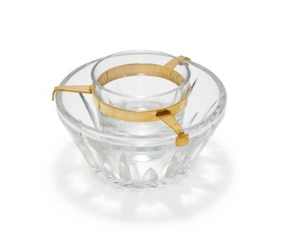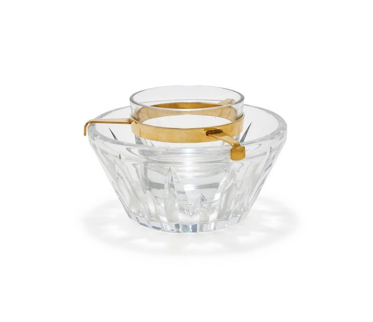 BACCARAT, A LARGE GLASS CAVIAR BOWL The moulded facetted glass bowl with polished gilt insert containing a polished glass inner bowl, glass bowls stamped Baccarat France 17.5cm diameter Condition Report: No apparent cracks or chipsSome light wear to the gilt insertWobblesLight scratches to the baseCondition Report Disclaimer