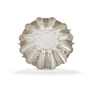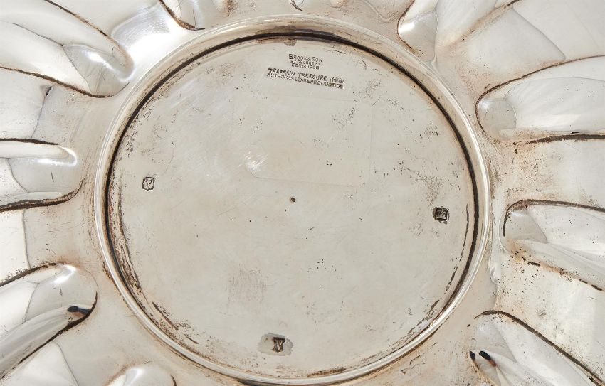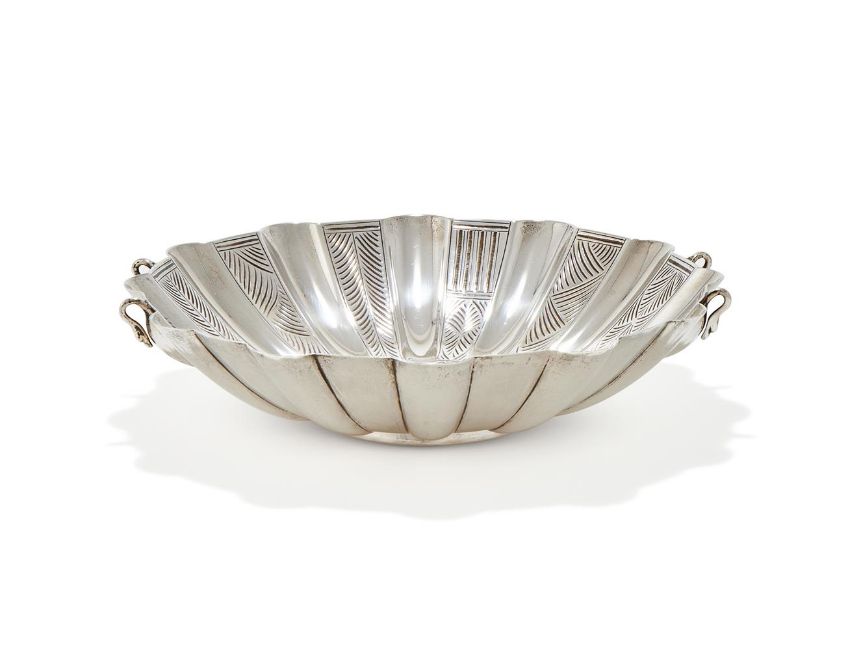 A SCOTTISH SILVER REPRODUCTION TRAPRAIN LAW TREASURE AMPHITRITE BOWL BROOK & SON, EDINBURGH 1926 The lobed body with four swan handles and alternating engraved panels, the inner base of the bowl engraved with the Nereid Amphitrite, the mother of Poseidon, riding a sea panther 29.5cm diameter 1076g (34.6oz) Traprain Law is a volcanic outcrop to the east of Edinburgh, and was the site of the main settlement of the Votadini tribe in Roman Britain, who by the fifth century AD had become allies of Rome, acting as a buffer between the Roman Empire and the hostile far Northern tribes. In 1919 archaeologists were excavating the Votadini hill fort on Traprain Law and discovered the largest hoard of Roman silver ever discovered outside the boundaries of the Roman Empire, containing over 250 individual objects and weighing 23 kilograms. The site excavations revealed evidence of craft working including silversmithing, and much of the hoard had been meticulously cut into fragments as hack silver to be melted down, either for use as trading currency, or for making into new pieces of silverware. The Roman pieces in the hoard included tableware such as platters, bowls, spoons and jugs, as well as basins, mirrors and containers for bathing purposes, and a some were still complete. The hoard also included later made pieces such as a massive chain and early Christian silver gilt vessel which appear to have been made from the earlier Roman silver. The silver may have originally been diplomatic gifts to the Votadini, or payment from the Romans for securing the peace along the Empire's northern frontier, at a time when the Romans were retreating southwards as their Empire in Britain was collapsing. It is believed that the hoard was buried in the later fifth century AD. Upon its discovery in 1919 the hoard was immediately transferred to the National Museum of Scotland in Edinburgh. The Edinburgh silversmiths Brook & Son were then tasked with restoring the pieces to as near to their original appearance as possible, and they were given licences to copy the pieces to sell in their shop in George Street. The bowl offered here is a copy of one of the more complete bathing bowls found amongst the hoard. After restoration the hoard became part of the collection of the National Museum of Scotland.  Brook & Sons was established in 1891 at 87 George Street Edinburgh, and were Royal Warrant holders as Goldsmiths to Queen Victoria and George V, also having responsibility for looking after The Honours of Scotland (The Scottish Crown Jewels). Brook & Son closed in 1951, and rival jeweller and silversmiths Hamilton & Inches moved into their 87 George Street premises in 1952. Hamilton & Inches are still based in the same George Street building today.