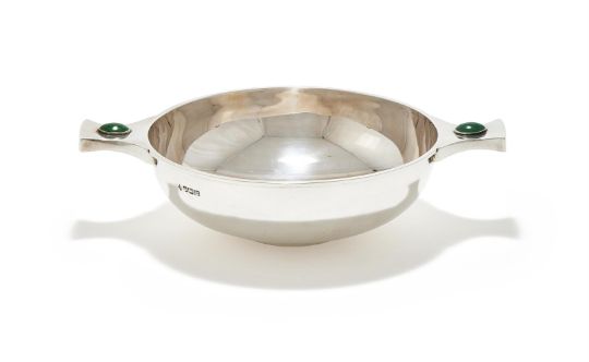 AN EDWARDIAN SILVER QUAICH MARTIN, HALL & CO., SHEFFIELD 1904 The handles inset with oval aventurine quartz and on a circular foot 25cm long 370g (11.9 oz) gross Provenance: An Anglo-French Collection Of Silver