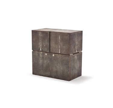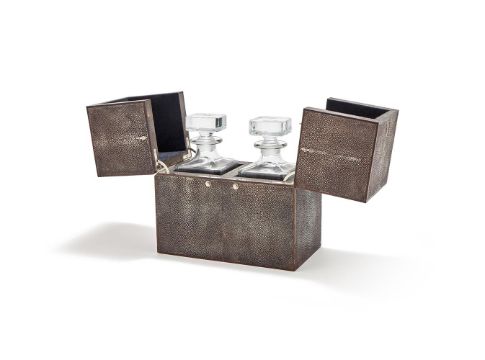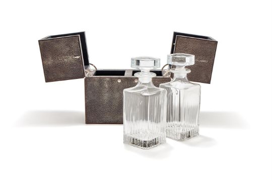 A SHAGREEN CLAD TWO BOTTLE TANTALUS MODERN With two clear glass decanters and stoppers 27cm high Provenance:The Silver Collection From a Regent's Park Home, London