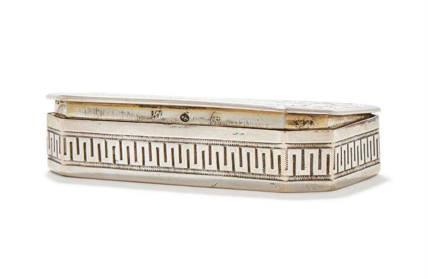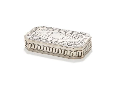AN AUSTRIAN SILVER BOX LEMBERG CIRCA 1810 With canted corners, engraved with foliage and a vacant cartouche 9cm long 127g (4.1 oz) Provenance: Élie de Rothschild (1917-2007)Thence by Descent  Condition Report: Marks are partially obscuredHinge goodNo personal engravingDecoration goodCover closes wellLight scratches and wear commensurate with age and useCondition Report Disclaimer