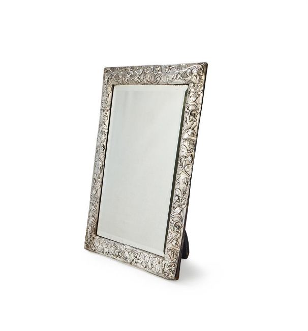 AN EDWARDIAN SILVER MOUNTED EASEL BACKED MIRROR WILLIAM COMYNS, LONDON 1901 With a chased foliate and floral border to a matted ground 58cm highProvenance: An Anglo-French Collection Of Silver