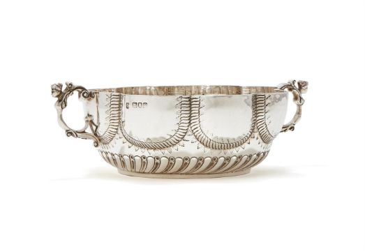 A VICTORIAN SILVER TWIN HANDLED LOBED BOWL MAKER'S MARK LS, LONDON 1896 With twin mask capped scroll handles, a lobed and fluted bowl 25.5cm long 535g (17.2 oz)Provenance: An Anglo-French Collection Of Silver Condition Report: Marks are partially obscured, maker's mark possibly overstriking that of another, stamped beneath Lambert, Coventry St., LondonNo engravingStands wellSterling standardLight scratches and wear commensurate with age and use Condition Report Disclaimer