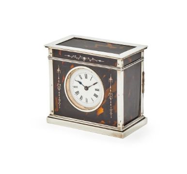 Y A SILVER AND TORTOISESHELL MOUNTED CLOCK CHARLES & RICHARD COMYNS, LONDON 1919 French movement, white dial with Roman numerals, the case inlaid with foliate swags 11.5cm longProvenance: An Anglo-French Collection Of Silver Condition Report: Marks are clearRighthand side panel coming away from mountTop left corner of tortoiseshell is crackedTop lefthand side panel with piece of tortoiseshell that has cracked and can fall outDoor hinge good and closes wellStands wellNo engravingMovement functioning, comes with a keyDial with hairline crack at 11 o'clockHands goodLight scratches and wear commensurate with age and useCondition Report Disclaimer