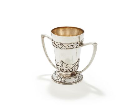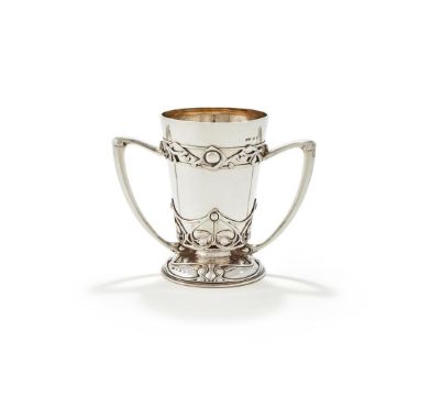 AN EDWARDIAN SILVER TWIN HANDLED CUP ELKINGTON & CO. LTD., PATTERN 21954, BIRMINGHAM 1902 The removable central hammered beaker in a twin harp handled frame, applied with scrollwork and on a circular pedestal foot 27cm long 1295g (41.65 oz) Purchased Didier Antiques. Kensington, London 30 August 2001Provenance: An Anglo-French Collection Of Silver Condition Report: Marks are well struckWobblesFoot is slightly misshapedNo engravingThe central beaker screws down wellSome heavier scratches to the bodyLight scratches and wear commensurate with age and useCondition Report Disclaimer