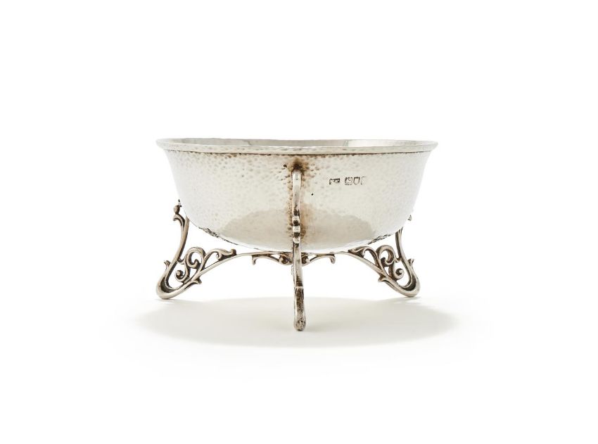 AN EDWARDIAN SILVER HAMMERED BOWL MAPPIN & WEBB, LONDON 1904 On three scroll feet 14.5cm diameter 246g (7.9 oz) Provenance: An Anglo-French Collection Of Silver Condition Report: Marks are partially rubbedStands wellNo engravingLight scratches and wear commensurate with age and use Condition Report Disclaimer