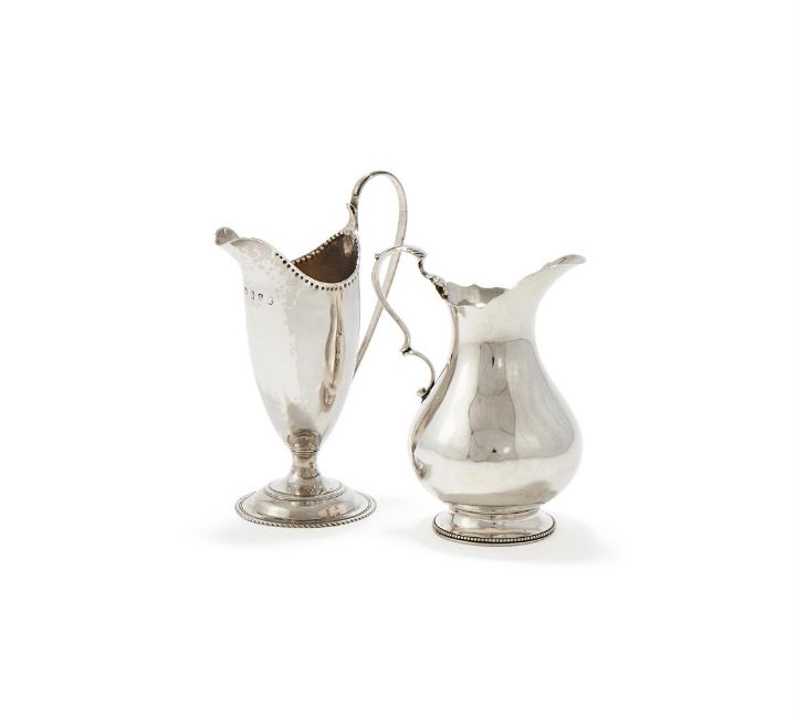 A GEORGE III SILVER HELMET SHAPED CREAM JUG MAKER'S MARK TS, LONDON 1786 With a beaded border, high clip handle and on a circular pedestal foot 15cm high Together with: A VICTORIAN SILVER BALUSTER CREAM JUG MAPPIN & WEBB, LONDON 1869 With a leaf capped double scroll handle and on a circular beaded foot 12cm high 211g (6.8 oz) gross Provenance: An Anglo-French Collection Of Silver