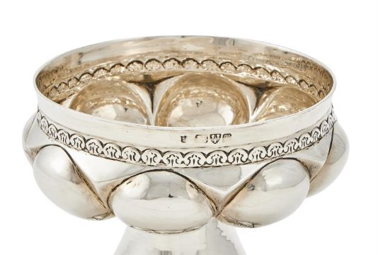 AN EDWARDIAN SILVER CIBORIUM GEORGE NATHAN & RIDLEY HAYES, CHESTER 1907 With a lobed body and chased decorative band, on a conforming pedestal foot 12cm high 387g (12.45 oz) Provenance: An Anglo-French Collection Of Silver