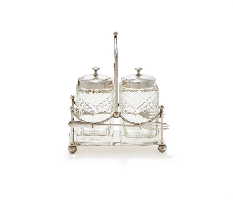 A SILVER PICKLE JAR STAND MARTIN HALL & CO., SHEFFIELD 1911 With a loop handle, the frame with ball finials and on four ball feet, two cut glass jars with silver covers and two Old English pattern pickle forks (one by Atkin Brothers, Sheffield 1906) 18cm long 662g (21.3 oz) weighableProvenance: An Anglo-French Collection Of Silver