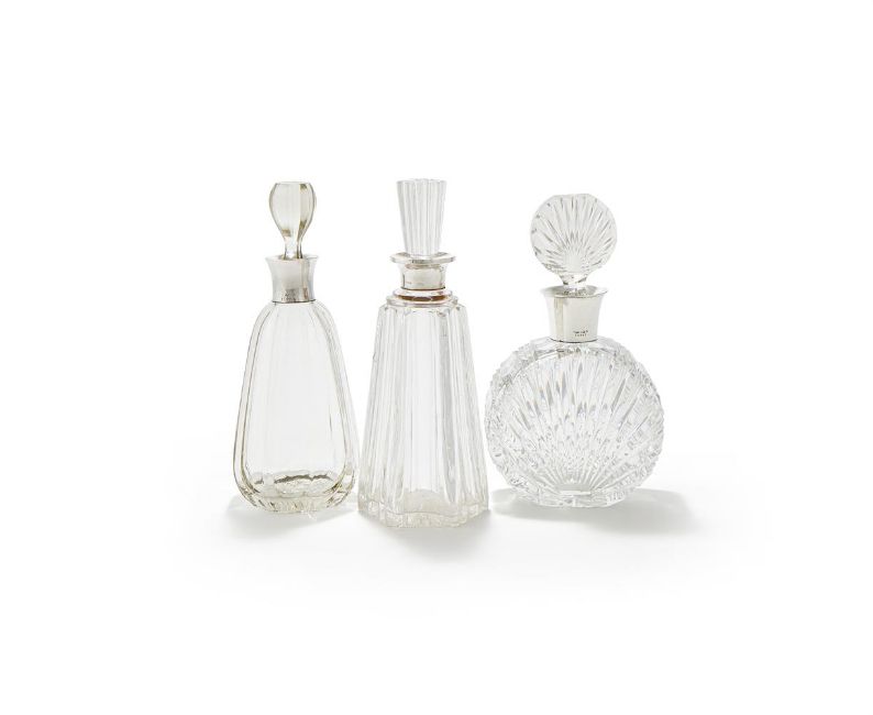 A SILVER MOUNTED GLASS DECANTER THOMAS WEBB & SONS LTD., LONDON 1901 With a silver collar and tapering facetted body 28cm highTogether with: A silver mounted glass decanter John Grinsell & Sons, Birmingham 1925 With a silver collar and facetted body 27.5cm high A silver mounted glass decanter John Grinsell & Sons, Birmingham 1929 With a silver collar and facetted body 26cm highProvenance: An Anglo-French Collection Of Silver