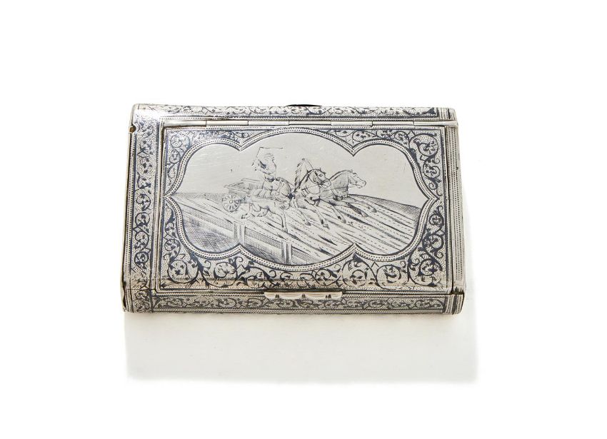 A RUSSIAN SILVER AND NIELLO CIGARETTE BOX ASSAY MASTER LEV OLEKS, MOSCOW 1884, 84 ZOLOTNIKI The cover with a cart being pulled by three horses within a shaped oval reserve and foliate scroll decoration, with a hinged striker and compartment 11.5cm long 253g (8.15 oz) Provenance: An Anglo-French Collection Of Silver