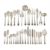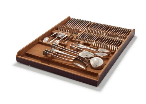 AN AUSTRIAN SILVER TABLE SERVICE VIENNA, POST 1922 .800 STANDARD Engraved HF Comprising: Twelve table forks Twelve table spoons Twelve dessert forks Twelve dessert spoons Twelve soup spoons Twelve fish forks Twelve fish knives Twelve tea spoons Twelve coffee spoons Twelve fruit forks Twelve cake forks A soup ladle A pair of serving spoons A smaller serving spoon A pair of salad servers A pair of sauce ladles A pair of asparagus tongs A pair of fish servers A pair of carving forks A small pair of carving forks Four skewers A saucisson fork A pair of sugar tongs A butter knife A pastry slice An ice cream server A pair of meat serving tongs A cheese slice A small serving slice A cheese knife A caviar knife A serrated knife A jam spoon A small serving fork 8350g (268.45 oz) Together with the following with steel fittings: Twelve table knives with stainless steel blades Twelve dessert knives with stainless steel blades Twelve fruit knives with stainless steel blades Together with three fitted drawers and an associated pair of electro-plated grape scissors Provenance: An Anglo-French Collection Of Silver