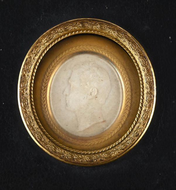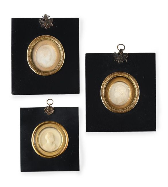 TWO WAX PORTRAIT RELIEFS OF SIR ROBERT PEEL AND THE DUKE OF WELLINGTON BY JOHN DE VEAUX, IRISH, CIRCA 1835/1836 Paper labels to reverse of each, black papier mache frames the frames 17.5 x 15cm TOGETHER WITH A FRAMED WAX PORTRAIT RELIEF OF GEORGE IV the frame 14 x 13cm Provenance: Selected items from a Private Collection, Norfolk Condition Report: With wear, marks, knocks and scratches as per age, handling, use, and cleaning. Were in barn storage and very dirty. The dirt has got under glass and wax has yellowed and discoloured, glass is scratched, frames with knocks and wear First two sealed backs so backs not inspected. Labels worn. Third- reverse seems to be fine but is open and lacks original backing Please see additional images for visual references to condition which form part of this condition report. All lots are available for inspection and Condition Reports are available on request. However, all lots are of an age and type which means that they may not be in perfect condition and should be viewed by prospective bidders; please refer to Condition 6 of the Conditions of Business for Buyers. This is particularly true for garden related items. All lots are offered for sale "as viewed" and subject to the applicable Conditions of Business for Buyer's condition, which are set out in the sale catalogue and are available on request.Condition Report Disclaimer