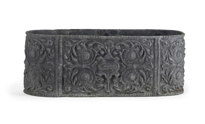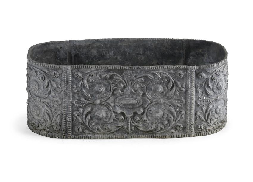 A RENAISSANCE REVIVAL LEAD PLANTER OR CISTERN POSSIBLY BY A P WHITE, LATE 19TH OR EARLY 20TH CENTURY Of oval form with all over scrolling floral relief decoration 21cm high, 55cm wide, 21.5cm deep