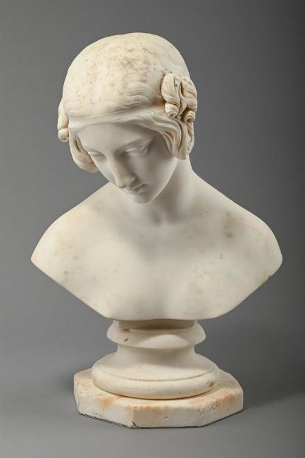 RICHARD JAMES WYATT (1795-1850), A WHITE MARBLE BUST OF A YOUNG NYMPH CIRCA 1830-1850 On a turned socle and octagonal plinth, signed to the reverse R. J WYATT ROMAE 51cm high, the base 23cm wide Provenance: Muriel Emily ('Molly') Ashley (née Spencer) (d.1954), 2nd wife of Wilfred William Ashley, 1st Baron Mount Temple, at Broadlands, Hampshire, and thence by descent to her niece, The Hon. Angela Delevingne (née Greenwood) (1912-2014). The grandson of the architect James Wyatt, Wyatt studied alongside John Gibson in Rome under Canova and Thorvaldsen. A frequent exhibitor at the Royal Academy, he settled in Rome and exhibited 10 works at The Great Exhibition and was awarded one of the four first-class gold medals retrospectively. This head is derived from a full length work by Wyatt "Nymph Bathing", an example of which is held by English Heritage, at Wrest Park (Accession number 88272040). Wyatt designed Nymph going to the Bath in 1831, originally for Maximilian de Beauharnais, Duc de Leuchtenburg, and exhibited the original at the Royal Academy in 1831. A comparable example of a depiction of just the head of a nymph by Wyatt is held in the National Trust Collection at Tyntesfield, North Somerset, acquired from Marseille Middleton Holloway (25 Bedford Street, Covent Garden, London) by William Gibbs (for £57 15s for the pair) in 1861 (NT 20163).
