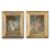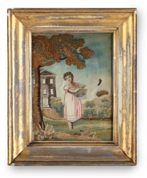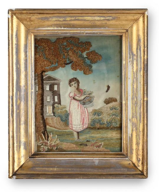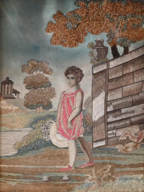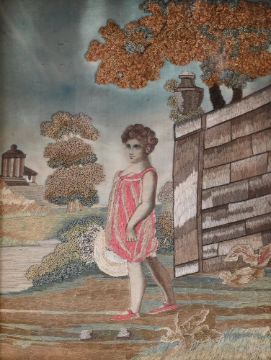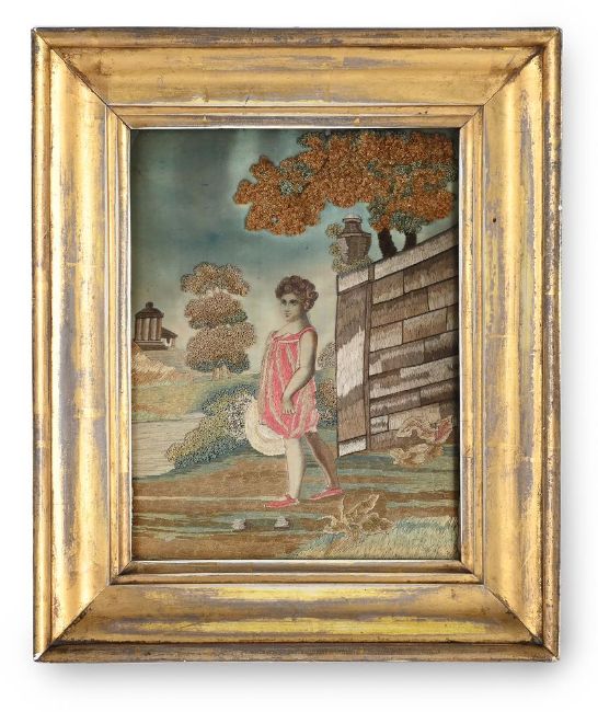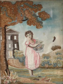 A PAIR OF LATE GEORGE III SILKWORK EMBROIDERY PICTURES CIRCA 1800-1820 Worked in a variety of threads on silk ground, each depicting children, the first with young girl with basket of flowers with English classical domestic building beyond, the second a boy depicted by a wall with tempietto folly beyond, in 19th century glazed gilt frames the frames 36.5 x 26.5cm