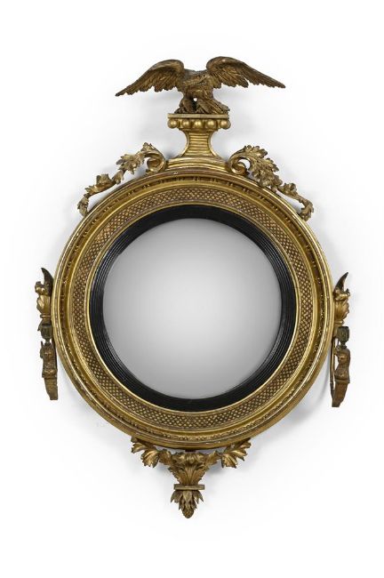 A REGENCY CARVED GILTWOOD CONVEX GIRANDOLE MIRROR CIRCA 1815 111cm high, 76cm wide, 24cm deep Provenance: Selected items from a Private Collection, Norfolk Condition Report: Marks, knocks, scratches and abrasions commensurate with age and use. Some old chips and splits. Some minor old repairs, the gilding has been refreshed at some point and bears the expected areas of loss, wear and minor discolouration. The mirror plate is a later replacement, the back board holding the plate in position is also later replaced. The gilded surface with some areas of additional chips and losses most notably to the scroll arm supports. The two carved floral sprays positioned on the top edge of the mirror are held with pins to holes within the frame, the positioning of this may not be correct and there may be some additional losses to this carving. Overall, of pleasing stature and carving with great presence in the room. Please see all additional images as a visual reference to this report.Condition Report Disclaimer