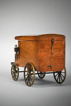 A LATE VICTORIAN OAK NOVELTY SMOKER'S CABINET IN THE FORM OF A CARRIAGE LATE 19TH CENTURY Cigarette box to driver's seat, pipe rack behind, interior with tobacco and pipe compartments and brass ashtray, brass wheels and carriage lamps, stamped Rd 294660 27cm high, 39cm long, 19.5cm deep Condition Report: Old loss and repair around lid hinge- visible to interior and exterior, lacks ashtray slide out to front of underside with one side of brass support still in place. Wear and surface marks throughout, metalware mostly lacks original finish, edge and corner losses, repaired pipe rack, incomplete metalwork to front of cigarette space, cutters seem to be functioning, Please see additional images for visual references to condition which form part of this condition report. All lots are available for inspection and Condition Reports are available on request. However, all lots are of an age and type which means that they may not be in perfect condition and should be viewed by prospective bidders; please refer to Condition 6 of the Conditions of Business for Buyers. This is particularly true for garden related items. All lots are offered for sale "as viewed" and subject to the applicable Conditions of Business for Buyer's condition, which are set out in the sale catalogue and are available on request.Condition Report Disclaimer