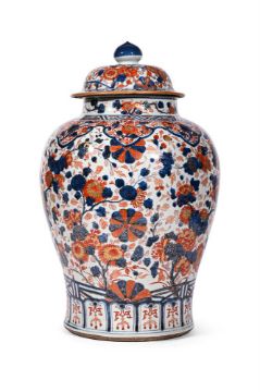 A LARGE CHINESE IMARI VASE AND COVER 18TH CENTURY 59cm high, the base 26cm diameter Condition Report: With wear, marks, knocks and scratches as per age, handling, use, and cleaning. Some rubbing to gilding, slight flaring to foot rim under UV but this may be rubbing. Underside of lid with later applied tape for cushioning contact with base. Foot with later owner/inventory(?) mark Please see additional images for visual references to condition which form part of this condition report. All lots are available for inspection and Condition Reports are available on request. However, all lots are of an age and type which means that they may not be in perfect condition and should be viewed by prospective bidders; please refer to Condition 6 of the Conditions of Business for Buyers. This is particularly true for garden related items. All lots are offered for sale "as viewed" and subject to the applicable Conditions of Business for Buyer's condition, which are set out in the sale catalogue and are available on request.Condition Report Disclaimer