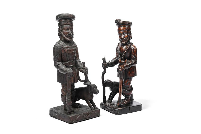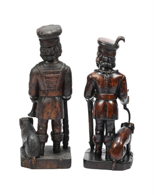 TWO GERMAN OR BAVARIAN CARVED WOOD FIGURES OF HUNTSMEN