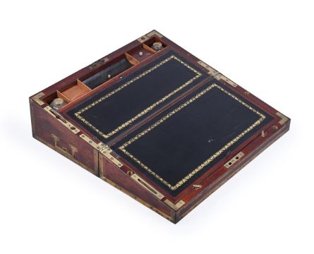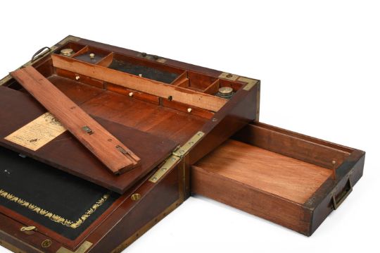 Y A GEORGE III MAHOGANY AND BRASS MOUNTED CAMPAIGN OR PURSER'S WRITING DESK OR BOX BY NICHOLAS MIDDLETON, EARLY 19TH CENTURY Fitted interior with side aperture for safe fixing to wood table support, with a hidden brass catch operating to reveal three shallow drawers with ivory handles, with a printed maker's label "N Middleton 162 The Strand..." 18cm high, 51cm wide, 25.5cm deep Provenance: Selected items from a Private Collection, Norfolk Nicholas Middleton is recorded at 162 The Strand, London, 1801-1810. In 1801 he is recorded as supplying the Royal Household with 'a Case for Box seat to the Nabob' costing £1 16s; and on 27 December 1810, a writing box costing £5 4s. 10d., recorded in the accounts on 22nd January 1812. [Windsor Royal Archives, 88916, 89031]. Please note, Dreweatts have applied for a de minimis exemption certificate for the ivory in this lot (Ref: VHFTTAWE).