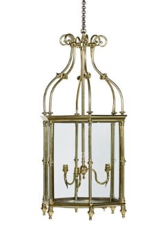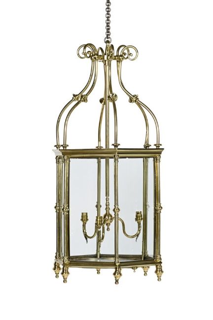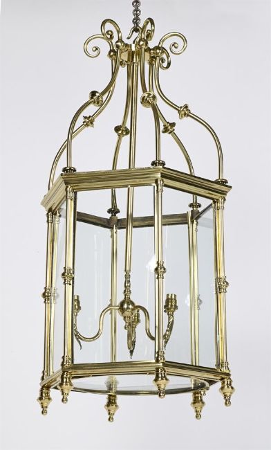 A LARGE BRASS HEXAGONAL HALL LANTERN MID 19TH CENTURY, INCORPORATING LATER ELEMENTS Scrolling top above modern three light fitment, glazed sides and base 94cm high, 46.5cm wide Please note, the dating for this lantern has been updated and differs from the printed catalogue, it should read, MID 19TH CENTURY, INCORPORATING LATER ELEMENTS
