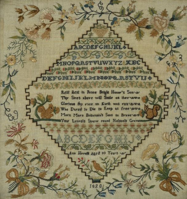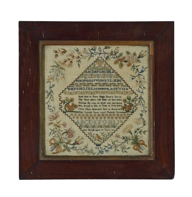 A REGENCY NORFOLK SAMPLER IN COMMEMORATION OF NELSON WORKED 1820 Worked by Ann Hovell aged 10 years, with characteristic shaped square cartouche infilled with lines of sampler alphabet above text "Rest best in peace bright Honor's son... your laurels strew round Nelson's Grave", with squirrels and ribbon tied floral spandrels, glazed mahogany frame the frame 45.5 x 44.5cm Provenance: Selected items from a Private Collection, Norfolk Saleroom Notice: Please note, the description has been updated and differs from the printed catalogue. The frame is mahogany not rosewood. Condition Report: Saleroom Notice: Please note, the description has been updated and differ from the printed catalogue. The frame is mahogany not rosewood. With wear, marks, knocks and scratches as per age, handling, use, and cleaning. Frame with knocks, losses to corners, slip regilded partially. Material colours generally quite strong- but main field has yellowed. Edges show pulling and with scattered small spotting and dirt ingress under glass throughout. Small spot insect losses. Hole to backing to reverse. Please see additional images for visual references to condition which form part of this condition report. All lots are available for inspection and Condition Reports are available on request. However, all lots are of an age and type which means that they may not be in perfect condition and should be viewed by prospective bidders; please refer to Condition 6 of the Conditions of Business for Buyers. This is particularly true for garden related items. All lots are offered for sale "as viewed" and subject to the applicable Conditions of Business for Buyer's condition, which are set out in the sale catalogue and are available on request. Condition Report Disclaimer