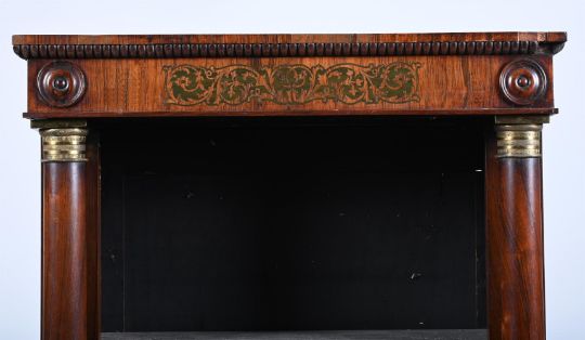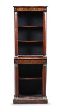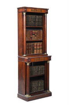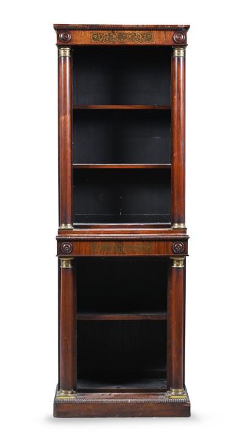 Y A GEORGE IV ROSEWOOD AND GILT METAL MOUNTED OPEN BOOKCASE CIRCA 1825 183.5cm high, 63.5cm wide, 35.5cm deep Provenance: Selected items from a Private Collection, Norfolk Condition Report: With marks, knocks, scratches, slight chips and abrasions commensurate with age and usePossibly shortenedSome small lengths of "reel" mouldings missing and one run of veneer on the right hand return of the skirting foot , but the veneer is present but loose.Metal mounts intact and brass inlay present and secureAdjustable shelves with sufficient pegs to hold all of the shelves present.The carcass flexes a littleNatural old cracks to the back panelsPlease see all additional images as a visual reference to condition. Condition Report Disclaimer