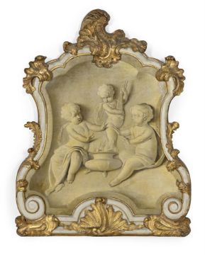 A FRENCH EN GRISAILLE PAINTING 19TH CENTURY Oil on canvas, in a grey painted parcel gilt frame, possibly an architectural element, the canvas depicting three cherubs, bearing signature and date 1747 (lower left) the frame 145cm high, 113cm wide overall
