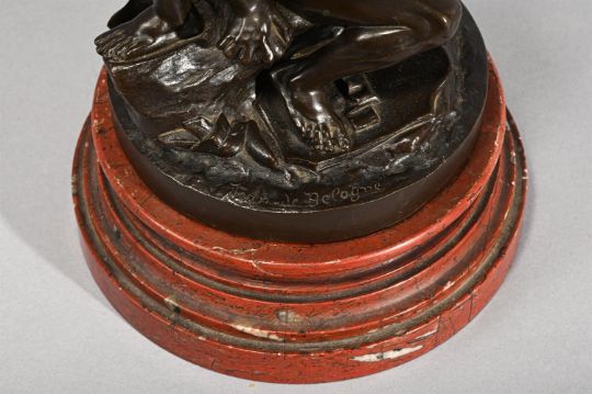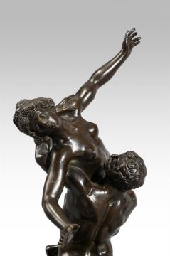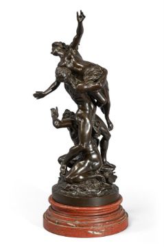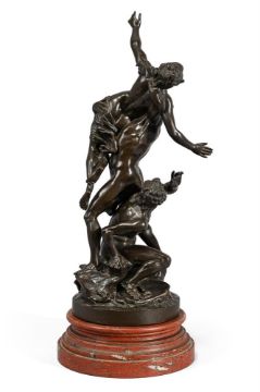 AFTER GIAMBOLOGNA, A BRONZE GROUP OF THE ABDUCTION OF THE SABINE WOMEN FRENCH, 19TH CENTURY Signed to the cast Jean Boulogne, on a red marble socle with revolving action, the revolving action marked Fizel Depose 48cm high overall