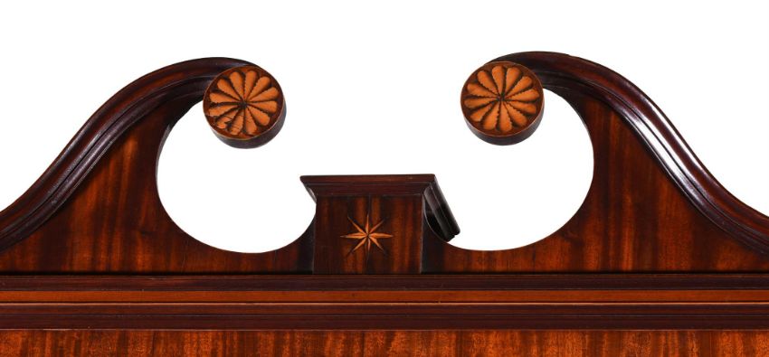A GEORGE III MAHOGANY AND INLAID CLOTHES PRESS AFTER DESIGNS BY GEORGE HEPPLEWHITE, CIRCA 1780 With twin oval panelled doors opening to five sliding trays 226cm high, 125cm wide, 62cm deep Condition Report: Marks, knocks, scratches commensurate with age and use. Some old splits and chips . Some minor old veneer losses. Some damage to waist moulding The handles are replaced with good quality handles in a contemporary style Drawer bottoms with minor splits. A key is present and opens both the drawers and door. Please see all additional images as a visual reference to this report Condition Report Disclaimer