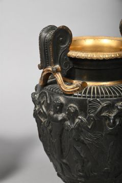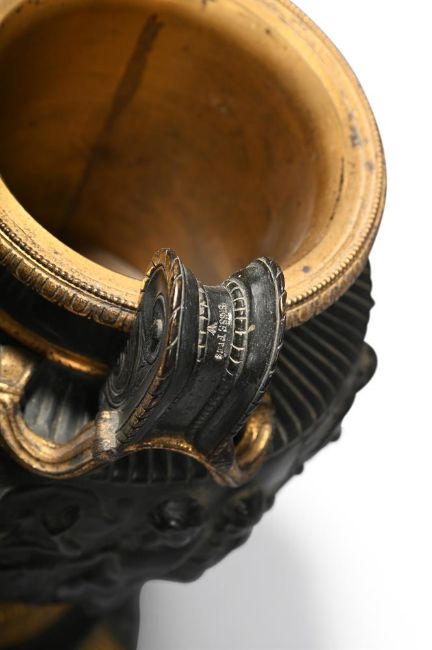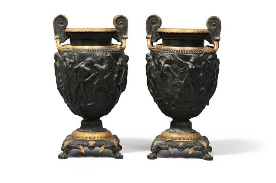 A PAIR OF PATINATED AND GILT URNS OF ATTIC KRATER FORM