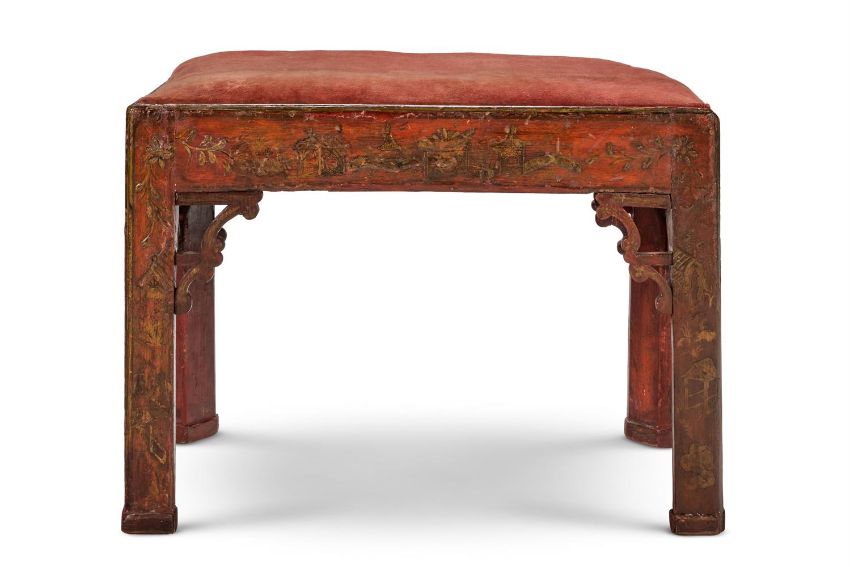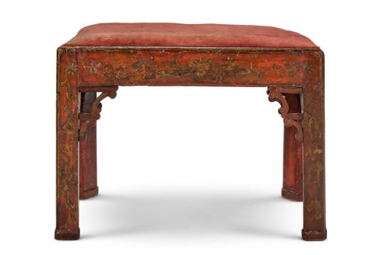 A RED AND GILT CHINOISERIE LACQUER STOOL