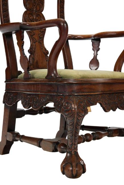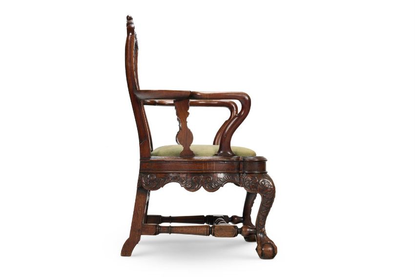 With a foliate carved back, down-swept arms, drop-in seat, and cabriole legs with claw and ball feet