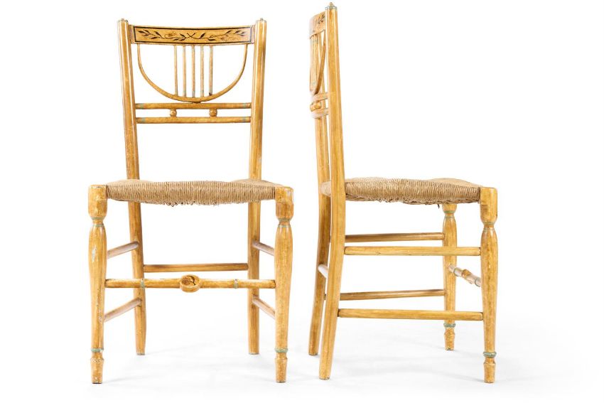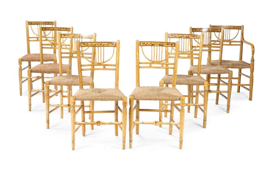 A SET OF EIGHT OCHRE PAINTED AND RUSH SEAT CHAIRS 20TH CENTURY Including an armchair, each with a curved bar toprail decorated with leafy vines, and with loose cushions The armchair 85cm high, 53cm wide, 44cm deep