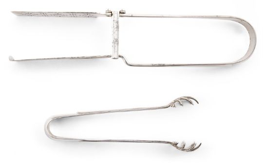 A PAIR OF VICTORIAN SILVER HANOVERIAN PATTERN SERVING TONGS FRANCIS HIGGINS III, LONDON 1890 Engraved HA 24cm long 199g (6.4 oz)Together with a pair of electro-plated beaded Old English pattern sugar tongs, with claw shaped bowls, 15.5cm long