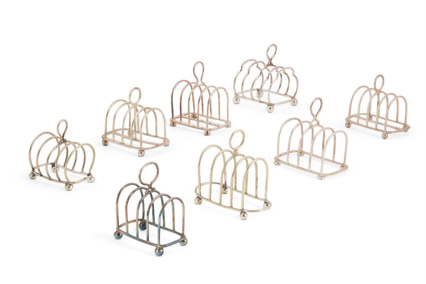 A COLLECTION OF TOAST RACKS To include: a pair of silver four division toast racks by Nayler Brothers, London 1947, with loop handles and on four ball feet, 10cm long; a silver four division toast rack by Hukin & Heath Ltd., Birmingham 1918, with a loop handle and on four compressed feet, 10cm long; together with five assorted electro-plated toast racks 285g (9.15 oz) gross weighable