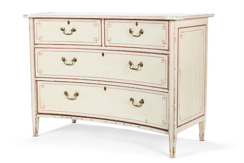 A WHITE AND RED PAINTED PINE CONCAVE FRONTED CHEST 19TH CENTURY Of two short and two long drawers on square tapering legs 86cm high, 118cm wide, 58cm deep Condition Report: The painted surface with various knocks, indentations, losses, chips, splits, signs of age and use in a domestic setting, there is also wear and colour variation, with some 'yellowing' to the white finish in places.The top surface with large area of loss down to underlying timber as well as other smaller areas of similar wear and splittingHandles are all replacements, there are other holes to the interior of the drawers but not the drawer fronts, this is probably been re-painted to disguise, where there are losses there does appear to be layers of previous paint beneath Please see additional images for visual reference to condition and appearance Condition Report Disclaimer