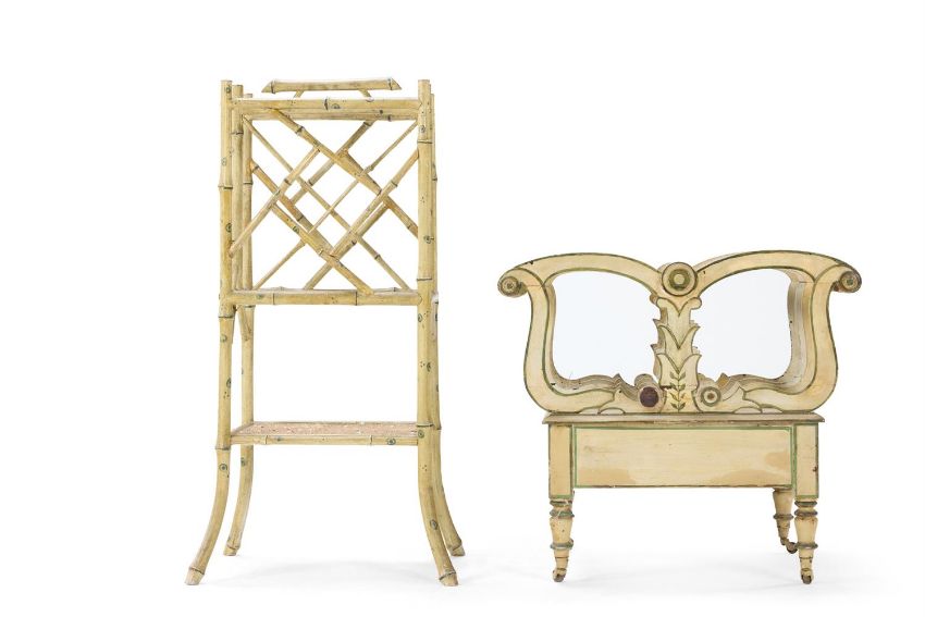 A REGENCY WHITE AND GREEN PAINTED CANTERBURY EARLY 19TH CENTURY Of lyre shape with a drawer below on turned legs with castors, knob handles missing, probably redecorated 55cm high, 58cm wide, 37cm deep Together with a tall simulated bamboo and rattan canterbury 85cm high, 45cm wide, 32cm deep Condition Report: The lyre-shaped canterbury - two knob handles missing and one turned roundel missing (on the reverse).Condition Report Disclaimer