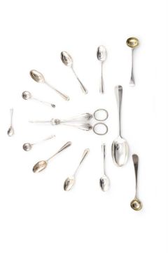 A COLLECTION OF SILVER FLATWARE To include: a pair of grape scissors by Atkin Brothers, Sheffield 1920, 17.5cm long; an Edwardian rat tail pattern dessert spoon by Francis Higgins & Son Ltd., London 1909, engraved AH, 17.5cm long; four Victorian rat tail pattern coffee spoons, maker's marks obscured, London 1895, 10.5cm long; two other similar; three assorted salt spoons; and two Old English pattern mustard spoons 268g (8.6 oz) Condition Report: There is no condition report available for this lot and is sold as found Condition Report Disclaimer