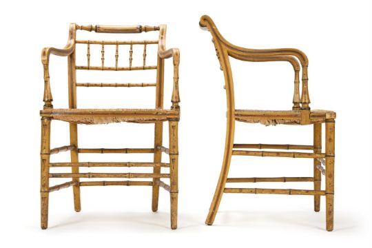 A PAIR OF REGENCY PAINTED SIMULATED BAMBOO ARMCHAIRS EARLY 19TH CENTURY Each with a rush seat 81cm high, 53cm wide, 50cm deep Condition Report: Both with marks, knocks, scratches, abrasions consistent with age and use, the simulated surfaces with chips and losses, scratches, signs of age and use in a domestic setting, the seats are probably original original, they are intact but again with signs of age and use Overall solid and stable Please see additional images for visual reference to condition and appearance Condition Report Disclaimer